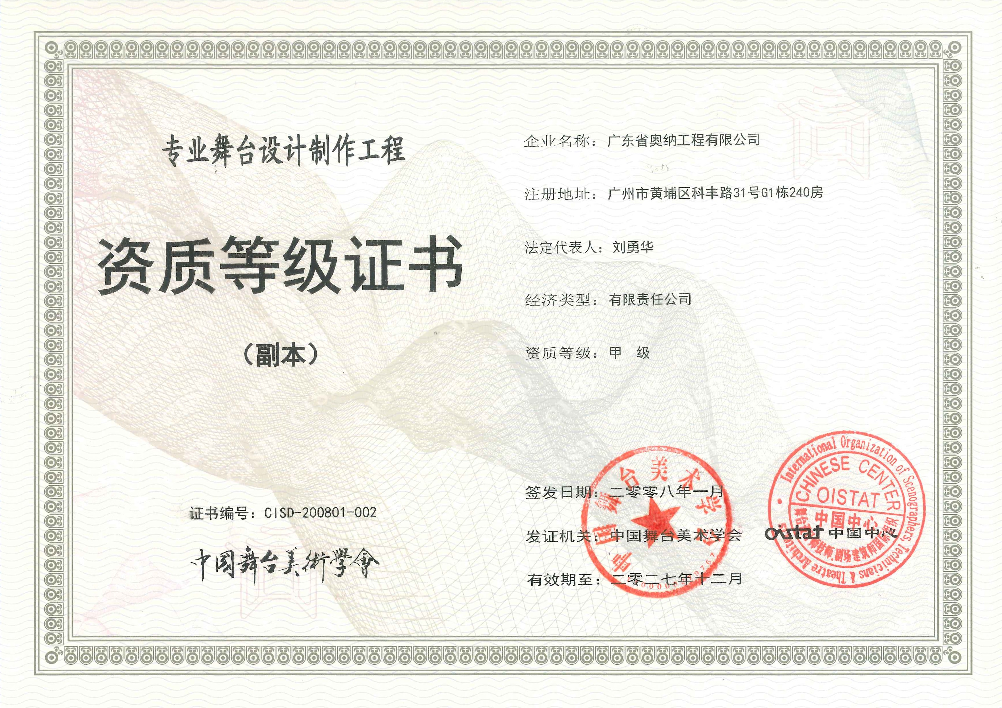 專業(yè)舞臺設(shè)計制作工程甲級證書