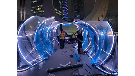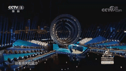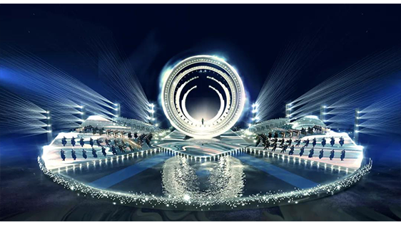 舞臺中心主體構筑分為四組,層層展開,用簡潔抽象化的海浪形式營造表演的氛圍空間。4組直徑不等的圓環(huán)尺寸分別為直徑20m、直徑17m、直徑15m、直徑12m,主體造型上采用全鋼結構形式搭建而成。圓環(huán)上吊掛燈光、水簾、冷焰火等設備,總體重量約100噸。