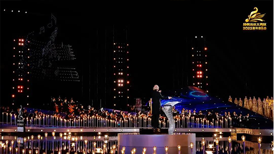 舞臺主體視覺以去舞臺化的概念為出發(fā)點,將舞美空間視覺方向朝城市景觀和裝置融合設計,滿足晚會功能性同時,也可作為城市景觀的一部分存在,賦予舞美多重的功能性。在光影渲染下,2022新年音樂會在新年第一天,深刻詮釋出大灣區(qū)“勇立潮頭敢為先,奮楫揚帆謀新篇”的恢宏氣勢。