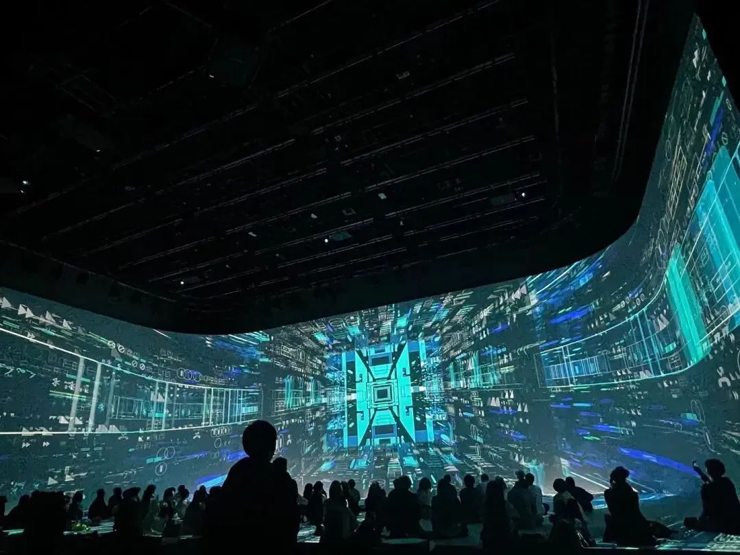 沉浸感是藝術(shù)家和觀眾都渴望達(dá)成的目標(biāo),數(shù)字媒體藝術(shù)要做到出色的沉浸感更為不容易,因此要借助最先進(jìn)的視覺、聽覺手段才能完成。“Eternal Art Space”展覽時長40分鐘,該項(xiàng)目與松下合作,八個數(shù)字藝術(shù)作品在一個安裝了180度高分辨率松下特大屏幕的空間中進(jìn)行展示,并通過disguise公司的mapping軟件制作XR/VR特效,結(jié)合d&b Soundscape聲音景觀系統(tǒng),為參觀者提供全新沉浸式體驗(yàn)。