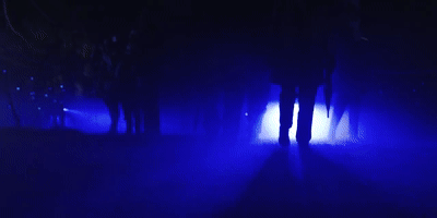 小路被薄霧中的金色燈光點亮,沿著昏暗的小路前行,樹梢閃爍,樹影婆娑。