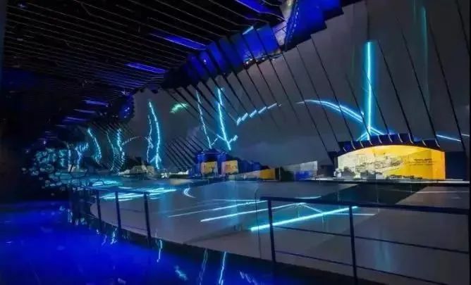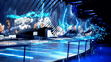 動(dòng)態(tài)的互動(dòng)鏡面墻呈現(xiàn)波浪運(yùn)動(dòng)狀,屏幕的律動(dòng)節(jié)奏與3D的LED海底景觀相呼應(yīng)。立體波浪視效,讓游客體驗(yàn)不一樣的海洋魅力,并有效傳達(dá)著環(huán)保信息。