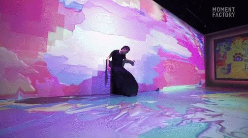 在【Symbiotic Studio】的“共生”空間,被潑墨式的彩色填滿,從腳下到四周到天花板,720度沉浸式包裹,都記錄著觀眾走過的痕跡,隨動(dòng)作大小、快慢變化以及觸摸感應(yīng)而變化。