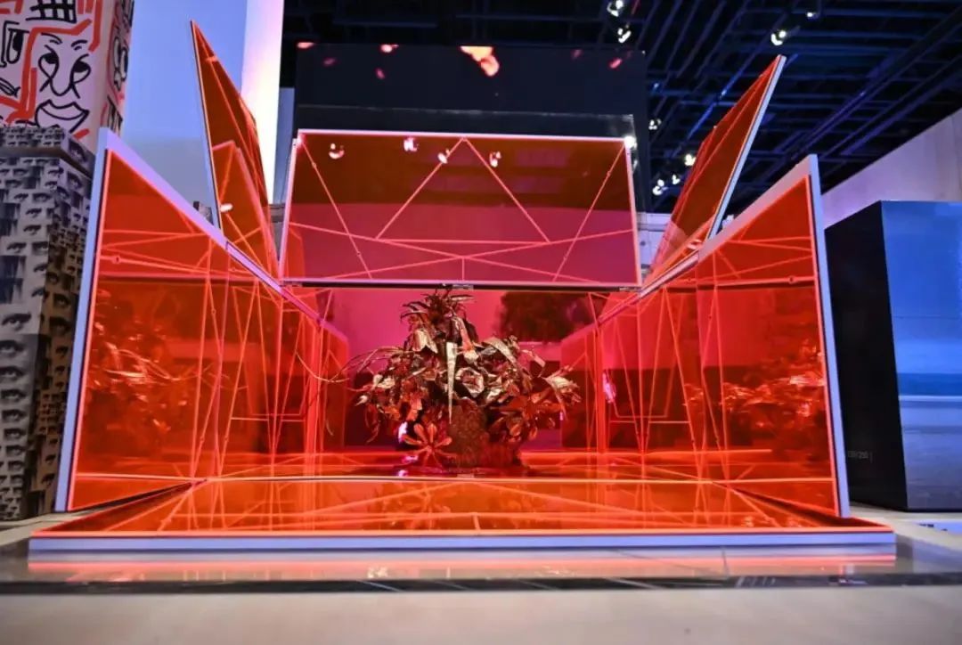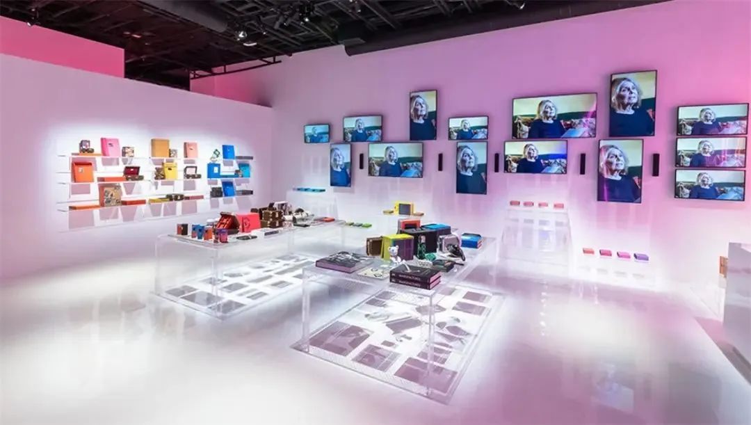 兩個(gè)主要空間中的第一個(gè)的設(shè)計(jì)思路看起來像是來自倉庫的靈感。箱子以一種交錯(cuò)但隱約帶有雕塑感的排列方式,與帶有屏幕的“魔法箱”并列在一起,每個(gè)箱子都堆放在從法國運(yùn)來時(shí)的板條箱上,這些板條箱上還有各種原始的運(yùn)輸標(biāo)簽。