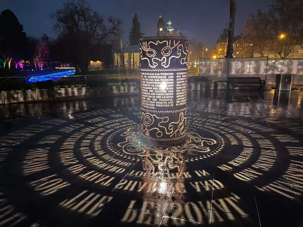 “承認(rèn)國家”裝置以 Dja Dja Wurrung 標(biāo)志性的燈塔屹立在羅莎琳德公園廣場上,這個(gè)兩米高的燈光雕塑燈火通明,其頂部和底部圍繞著 Dja Dja Wurrung 人們創(chuàng)作出的藝術(shù)作品。