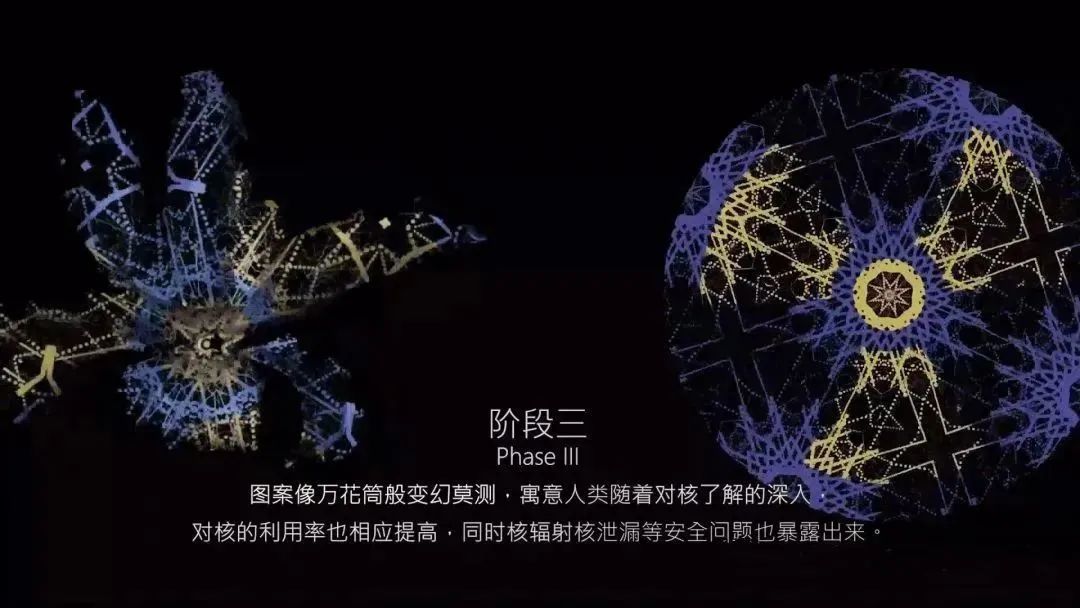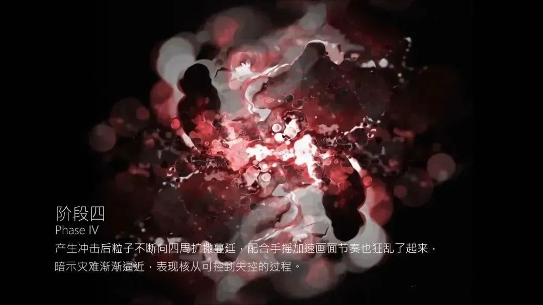 裝置整體分為投影和手搖控制兩部分。觀眾通過搖動握手裝置將速度控制在一定值,核花則以極速綻放;當速度超過一定范圍時,核花會爆炸。通過裝置“核花”,創(chuàng)作者希望告訴我們:核能是福是禍——這完全取決于人類如何使用核能,而不是核本身。