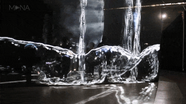 作品設(shè)置在一個沒有照明的6000平方英尺的倉庫中心,半透明的三角形墻壁上,液體般的光起伏著。抽象圖案的變化行為在秩序與混亂之間搖擺不定,加之有霧氣彌漫其中,光線模糊,參觀者仿佛置身于夢中。