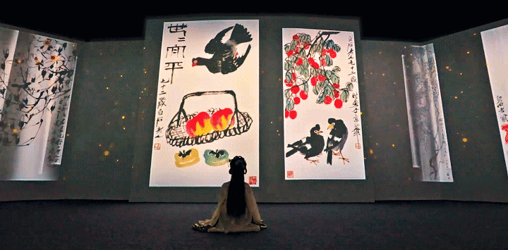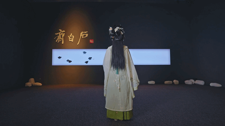 運用數(shù)字化技術合成并重構白石老人的藝術世界,通過藝術情景的融合,讓觀眾沉浸在特定空間內(nèi),將齊白石筆下之物一一活化。借助數(shù)字藝術的特點,我們得以跨越時間的維度,與齊白石燦爛的文化遺產(chǎn)重啟對話。這一場傳統(tǒng)文化與數(shù)字藝術的相遇,連接傳統(tǒng)與時代,讓文化跨越時空,重新煥發(fā)現(xiàn)代活力。