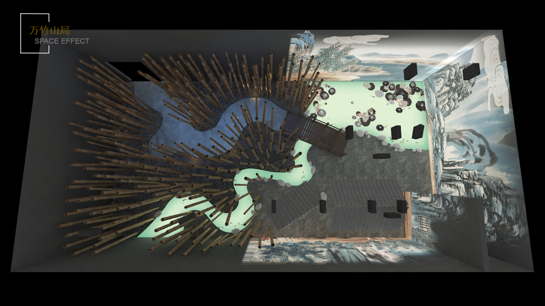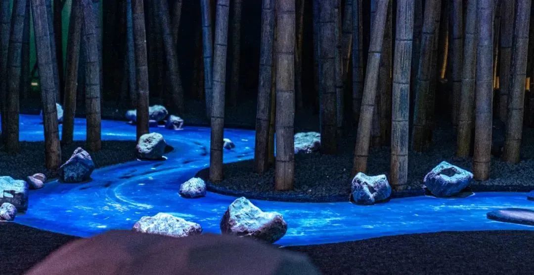 藝術團隊通過虛實結合創(chuàng)意,呈現(xiàn)齊白石的視覺記憶。通過竹林造景和霧森,打造圖中竹林意向。參觀者穿行于一片疏密有章的竹林,竹壁上動態(tài)呈現(xiàn)出白石老人不同時期的書法作品,竹林深處潺潺流水聲、鳥鳴聲間或傳來。