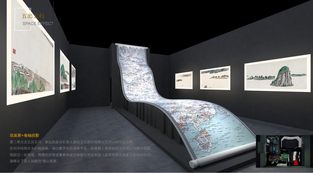 將白石老人作品與真實山川結合,呈現(xiàn)齊白石行旅軌跡。空間中間部分打造為巨幅畫軸,通過雙面屏和卷軸投影的數(shù)字化演繹手法,在畫軸上表現(xiàn)祖國大好河山與游歷線路,每經(jīng)過一處地域,兩側的雙面成像載體就會映射出對應畫作(及齊白石臨摹著名畫家在此地的作品),演繹出了后人知曉的《借山圖冊》。你將立于“五出五歸”的巨大畫卷前,看齊白石遠游的路,入目的景,鑒賞過的古人書畫,感受師前人與師造化所帶來的視覺洗禮。