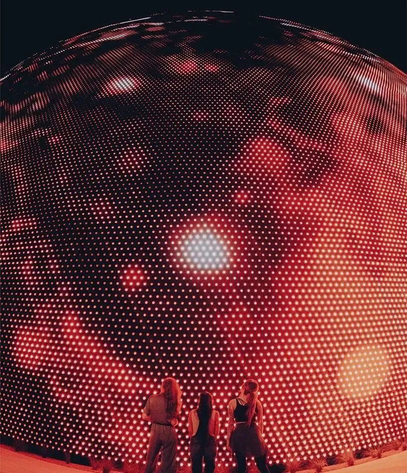 2023 年4月,由 Populous 設(shè)計(jì)的未來(lái)主義音樂(lè)場(chǎng)地球體 The Sphere 點(diǎn)亮了拉斯維加斯的天際線,并將其變成了一個(gè)迷人的照明奇觀。在首場(chǎng)演出期間,球體的外觀,被稱為Exosphere和世界上最大的LED屏幕,用于迷人的展示,展示了動(dòng)畫(huà)場(chǎng)景,包括煙花,月球,甚至一個(gè)巨大的眨眼球,用“你好世界”的信息迎接客人。