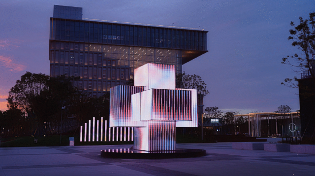 “智慧燈桿”基于“滴水湖”的實現(xiàn)海浪數(shù)據(jù),經(jīng)由算法生成高低起伏的輪廓形狀,再轉(zhuǎn)化為幾何形狀的LED矩陣,形成一片數(shù)字的“海浪矩陣”。
